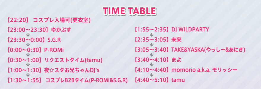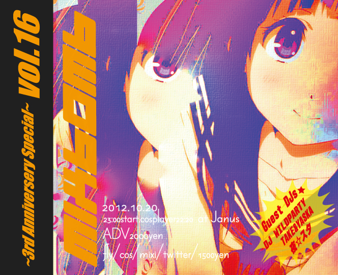 アニソン、ゲーソン、VOC@LOID、アイドルなど常にフロアを沸かし続けたまま突っ走るカオスなプレイで「MIX★BOMB」、「BunGeee☆」を中心に数々のパーティに出演中!